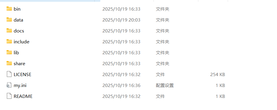 解压好后,默认是没有my.ini文件的,需要我们自己创建一个: